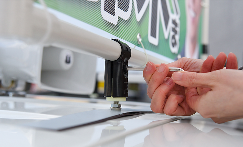 車体天井に合わせ看板からの足の長さを調節できるようにしてあり吸着面不足が起きないようにしています。